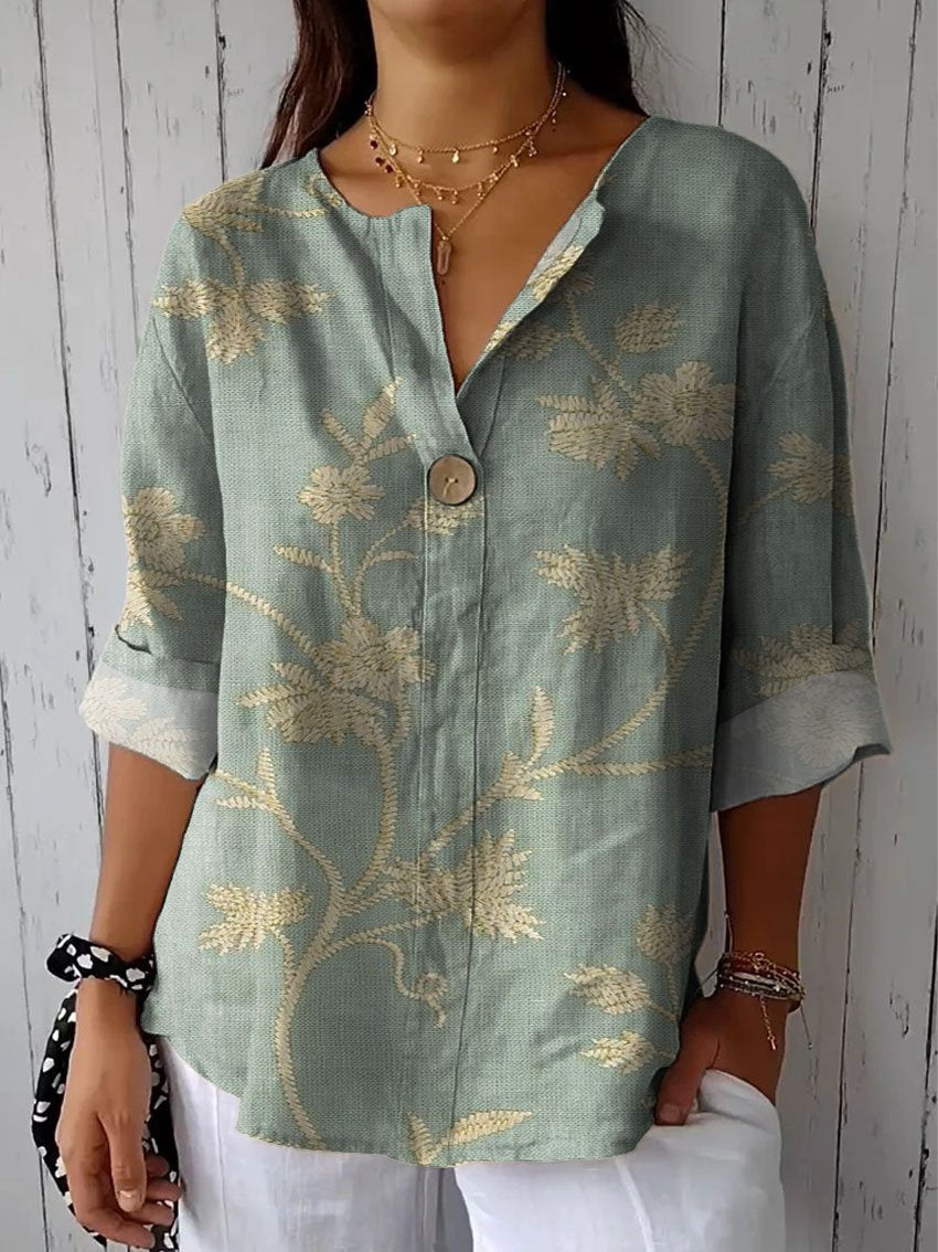 Women's Vintage Floral Art Print Casual Cotton Linen Shirt