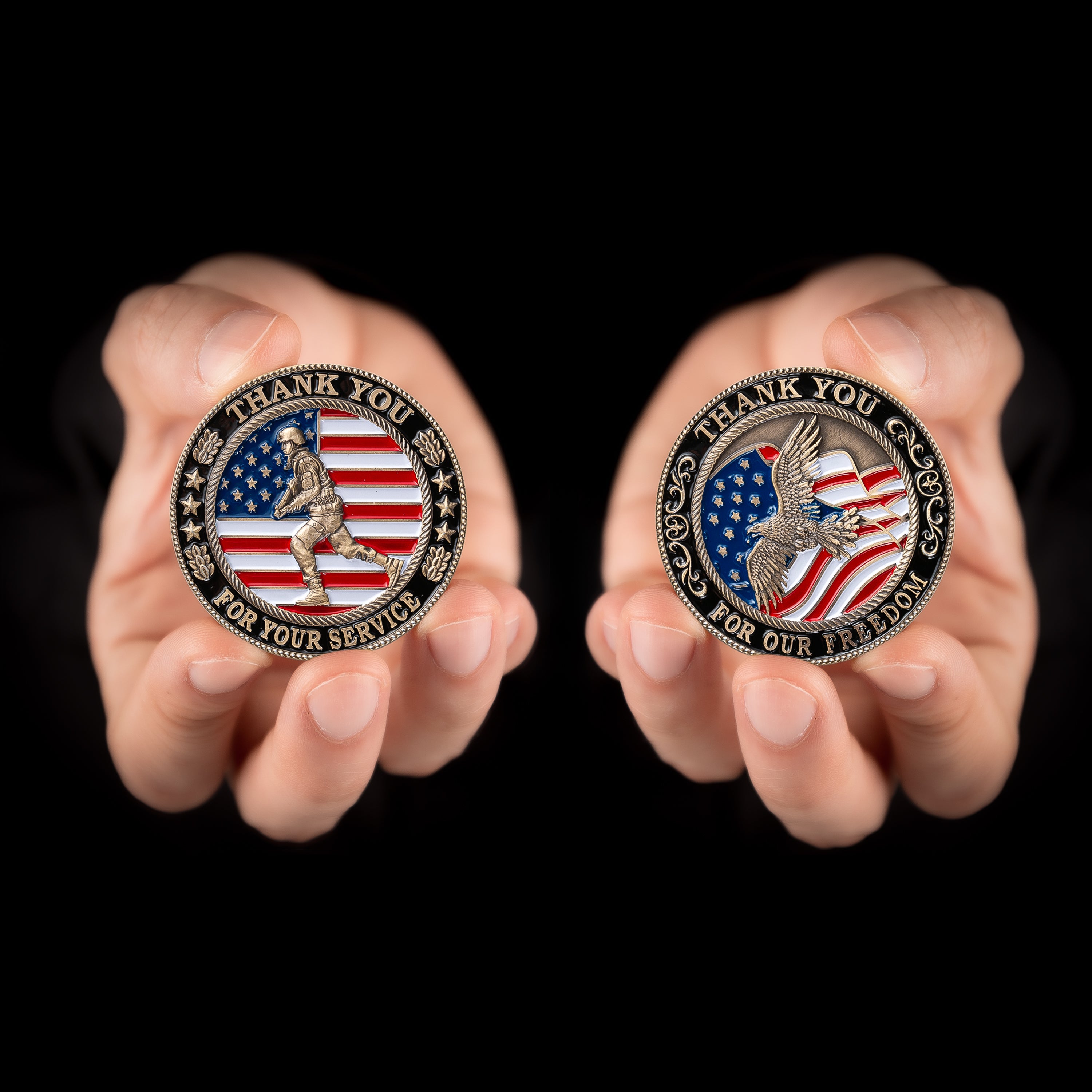 Il fronte della moneta dice: "Grazie per il tuo servizio", e il retro dice: "Grazie per la nostra libertà".